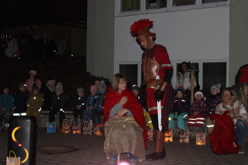 Der Höhepunkt war dann unsere stimmungsvolle St.-Martinsfeier. Mit leuchtenden Laternen zogen die Kinder stolz im Laternenumzug durch den Pausenhof. Beim Martinsspiel wurde die bekannte Geschichte vom Mantelteilen liebevoll nachgespielt – ein Moment, der nicht nur die Kinder berührte. Anschließend tanzten wir zusammen den funkelnden Lichtertanz, der den Abend in eine ganz besondere Atmosphäre tauchte.